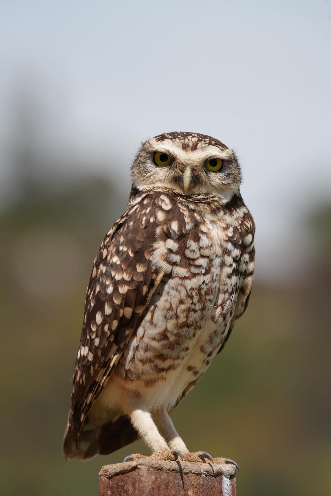 "Un Pequeño búho nativo de América, conocido por sus hábitos terrestres y diurnos sobre un poste en Paine."
